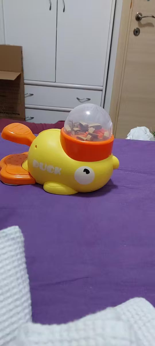 Simply fill it with small dry kibble or treats, and when your dog nudges or presses the duck, it releases food.